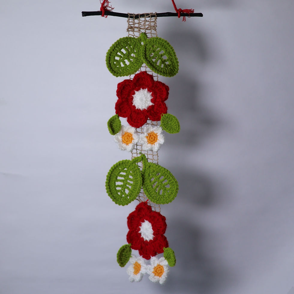 Hand-knotted jute wall hanging adorned with delicate crocheted daisies. A rustic yet cheerful touch for any nook, blending organic fibers with floral charm. Ideal for natural, boho-inspired spaces.